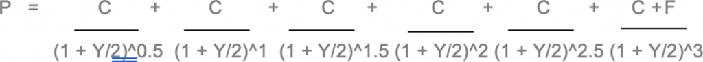 • 為了計算該息票債券的價格,必須將每個時期(即每0.5年)收到的付款折現至當前時間。 這些單個現值的總和是債券的公允價格。