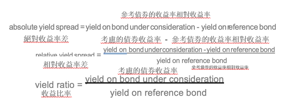 • 絕對收益率差 = 考慮的債券收益率-參考債券的收益率