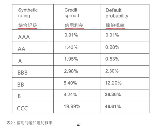 • CRA通常提供信用利差信息和違約概率。信用利差的典型示例如下