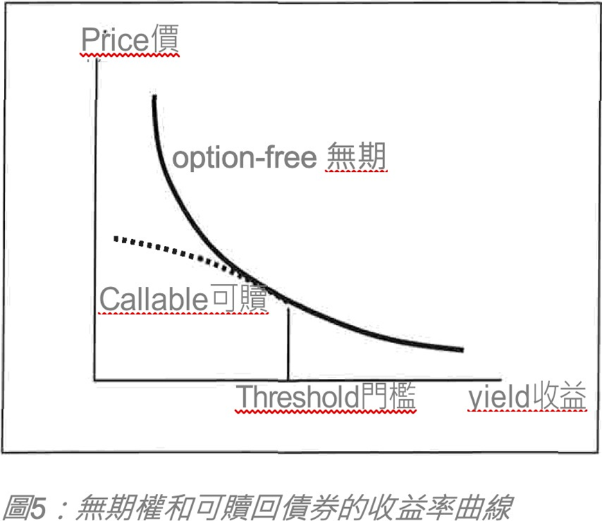 • 在可贖回債券的情況下,當利率降至某個閾值以下時, 價格收益率關係將變為凹形,即呈現負凸度。這是由於債券價格接近收回價而導致的價格壓縮,而收回價格是債券價值的上限。在這種情況下,利率提高1%對債券價格的影響要大於利率降低1%的影響。換句話說,負凸率會在利率下降時限制可贖回債券的價格表現。